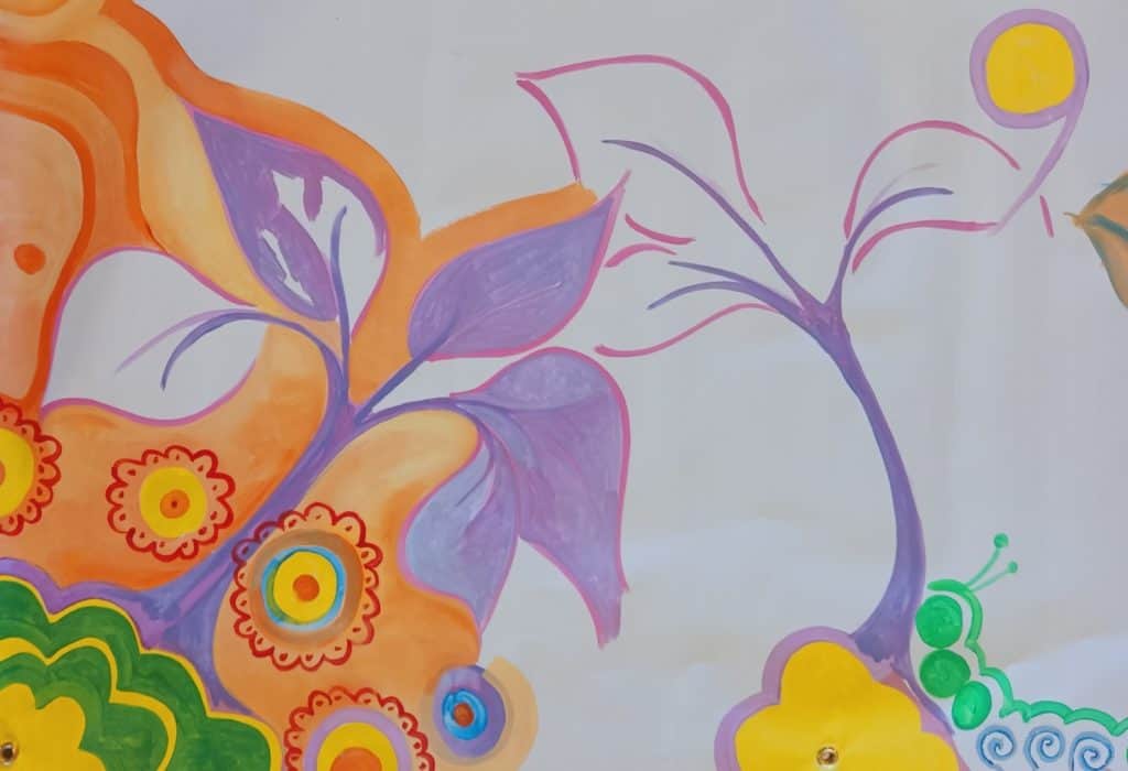 “We often see residents struggle with rigid thinking styles and perfectionism,” Mike says. “The Flow Garden Mural encourages participants to trust themselves and respond to the imagery without overthinking the ‘right,’ ‘best,’ or ‘perfect’ solution. So far, our mural has developed into a fanciful and colorful artwork. Perhaps this is a metaphor for the joy that awaits us when we are able to challenge ourselves to overcome what is holding us back!”